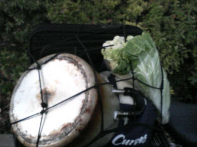 パソコンバッグ、寸胴鍋、畑脇で勝った白菜、最近通っているフィットネス用バッグが入っている。