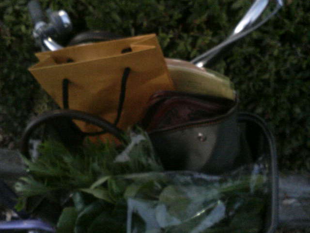 二枚目は前カゴだ。ここにも野菜が入っている。小松菜の水菜。黄土色の袋は駅前のビルで買った長男のネクタイ。ライブ用におしゃれな細いもの探していたのだ。緑のトートは今のセンタイ事務所通い用バッグだ。クリアファイルが顔を出している。手前のIBIZAの財布は私の幸運アイテム。この夏の「蟻の兵隊を観る会」の活動もこの財布で乗り切った。